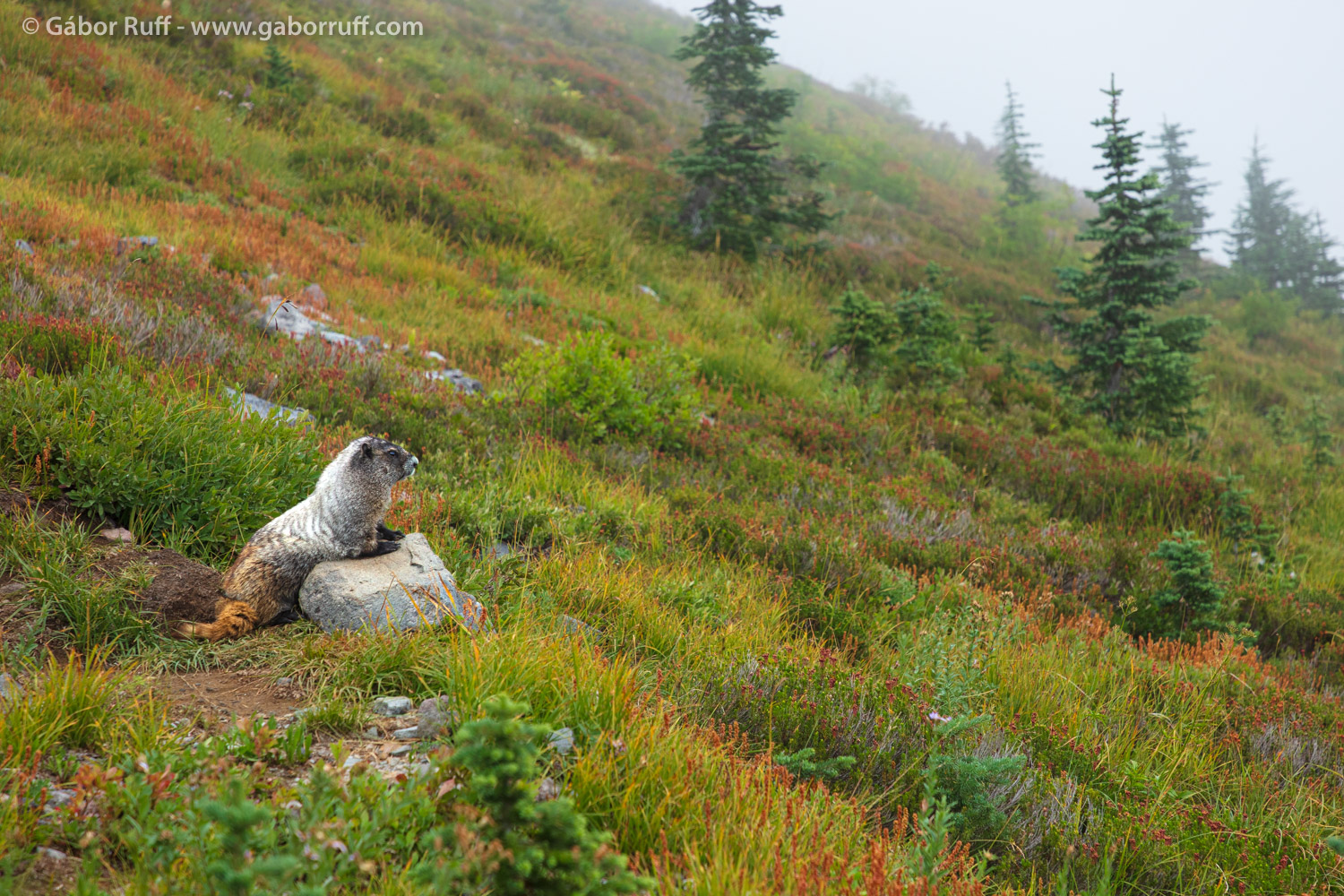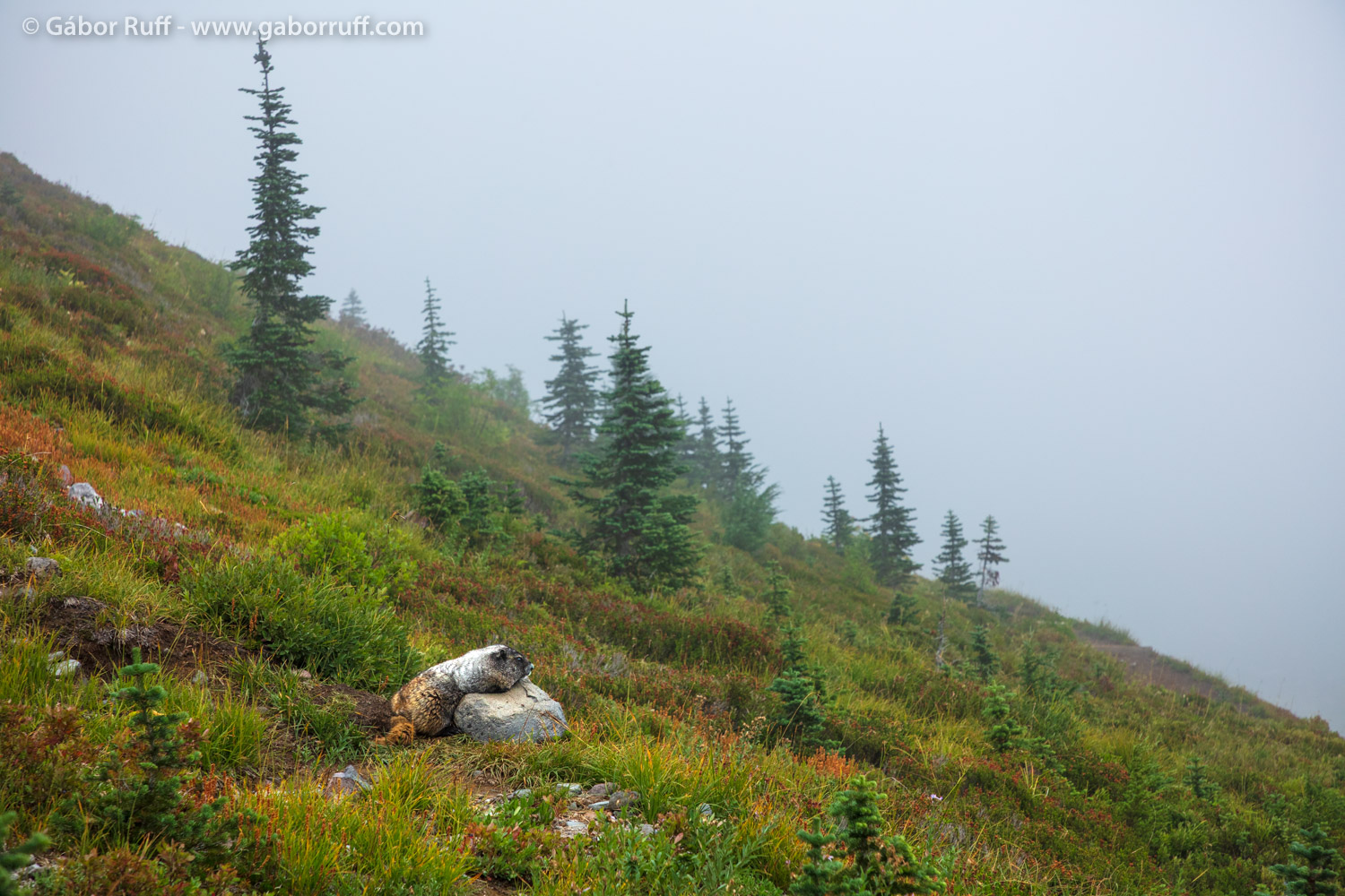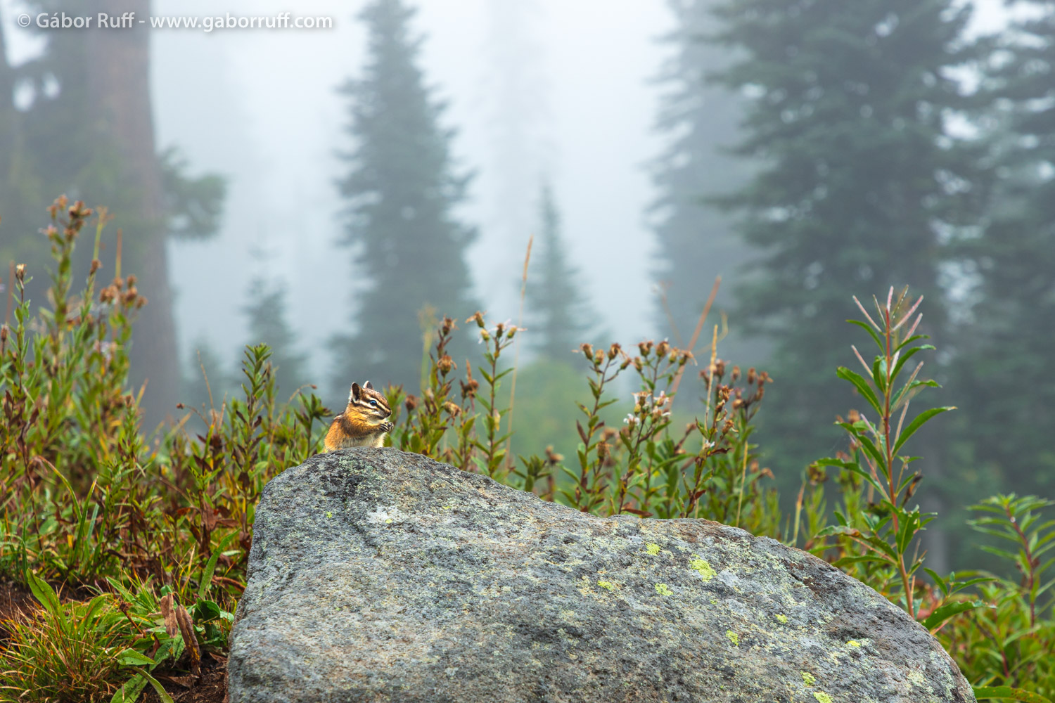 We spent two nights in the Paradise area of the park, with plans to explore the region, capture striking landscape photos, and hopefully spot some wildlife. We arrived just before sunset and headed straight to one of the scenic overlooks. Unfortunately, clouds rolled in quickly, partially obscuring the mountain. Soon after, a dense fog settled in, limiting visibility to just a few dozen feet. The fog lingered throughout the next day, making traditional landscape photography difficult. Still, we embraced the moody atmosphere and turned our attention to observing and photographing local wildlife—one of our favorite activities. During our visit, we encountered numerous yellow pine chipmunks (Tamias amoenus), a few mule deer (Odocoileus hemionus), and a particularly relaxed hoary marmot (Marmota caligata) that allowed us to approach quite closely while it rested. It only stood up briefly in response to distant warning calls from its mates but quickly returned to lounging once it realized there was no threat—clearly unbothered by our company.