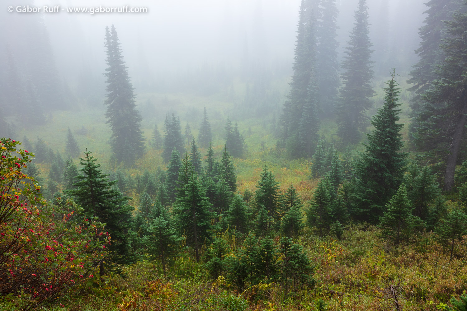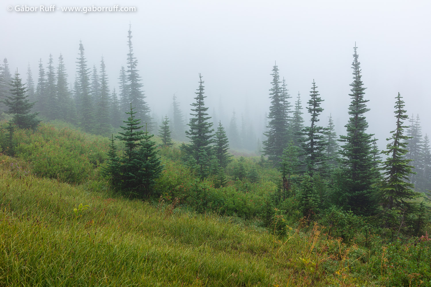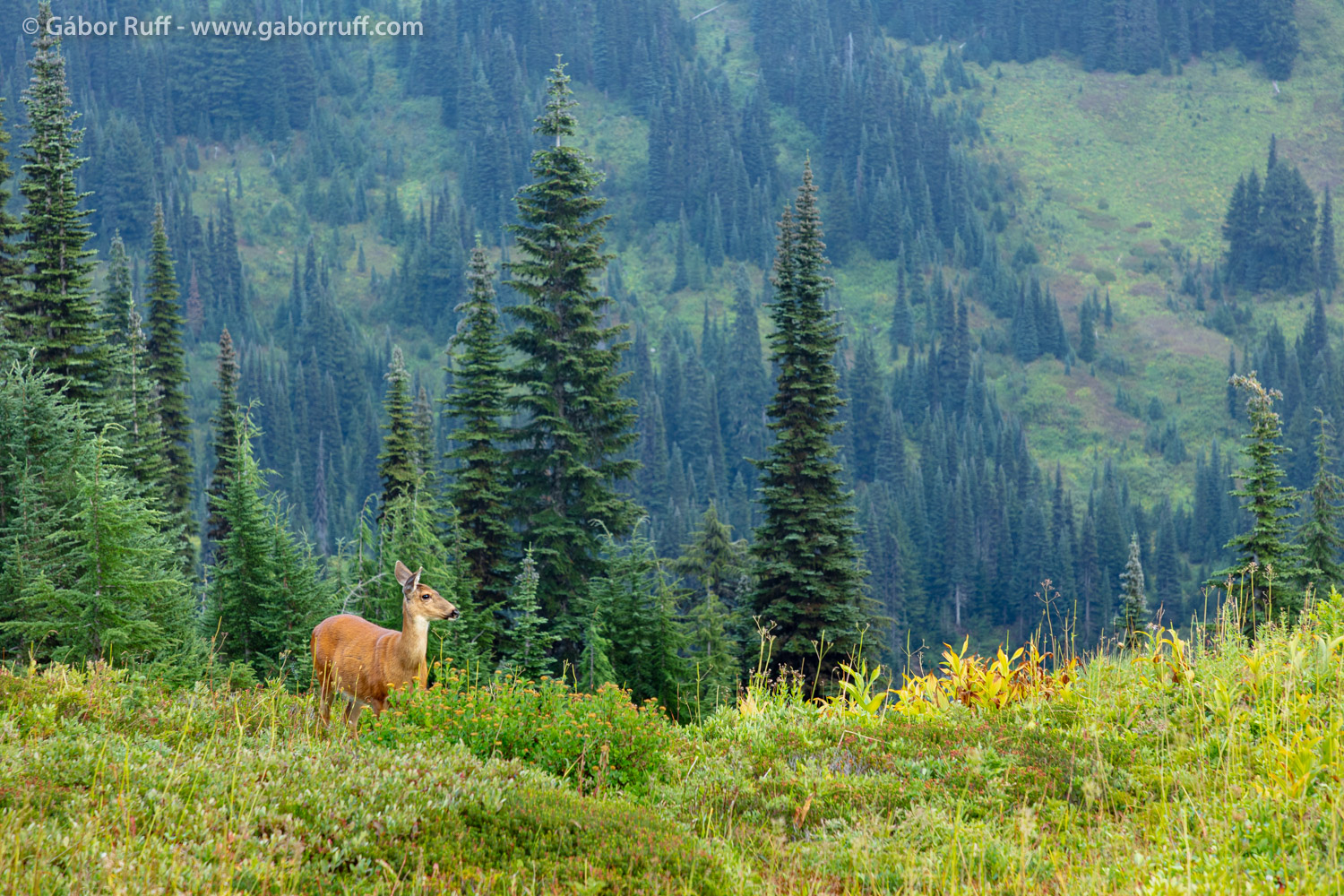 We spent two nights in the Paradise area of the park, with plans to explore the region, capture striking landscape photos, and hopefully spot some wildlife. We arrived just before sunset and headed straight to one of the scenic overlooks. Unfortunately, clouds rolled in quickly, partially obscuring the mountain. Soon after, a dense fog settled in, limiting visibility to just a few dozen feet. The fog lingered throughout the next day, making traditional landscape photography difficult. Still, we embraced the moody atmosphere and turned our attention to observing and photographing local wildlife—one of our favorite activities. During our visit, we encountered numerous yellow pine chipmunks (Tamias amoenus), a few mule deer (Odocoileus hemionus), and a particularly relaxed hoary marmot (Marmota caligata) that allowed us to approach quite closely while it rested. It only stood up briefly in response to distant warning calls from its mates but quickly returned to lounging once it realized there was no threat—clearly unbothered by our company.